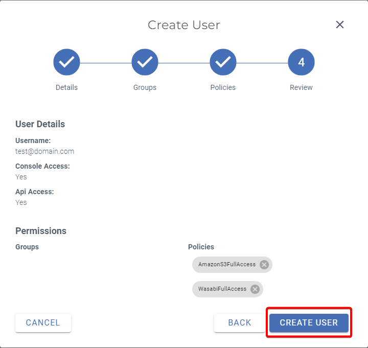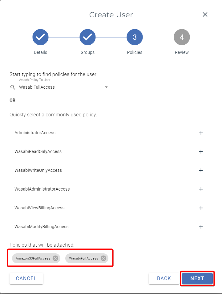 WasabiFullAccessandAmazonS3FullAccessand select Next. -