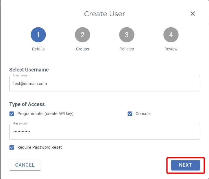Fill in the Username and Type of Access, for Just an API Key you will need to select Programmatic and Select Next.